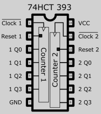 Wie ein Binärzähler aus Flipflops aufgebaut wird, hast Du im Kapitel "JK-Flipflop 74HCT107" schon kennengelernt. Jetzt verwenden wir dafür den Schaltkreis 74HCT 393, der zwei Vier-Bit-Binärzähler (also insgesamt 8 Flipflops) enthält. Beim Beschalten musst Du auf folgendes achten: