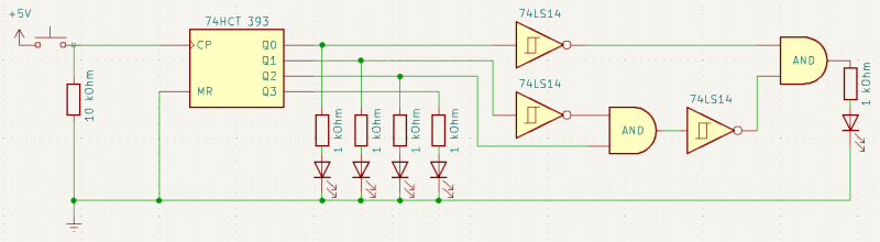 Immer dann, wenn die vierte LED ausgeht (d.h. die 8'er Stelle des Zählers von 1 zu 0 übergeht), muss die 16'er-Stelle ihren Zustand ändern. Das wird erreicht, indem der vierte Ausgang des ersten Zählers mit dem invertierten Clock-Eingang des zweiten Zählers verbunden wird.