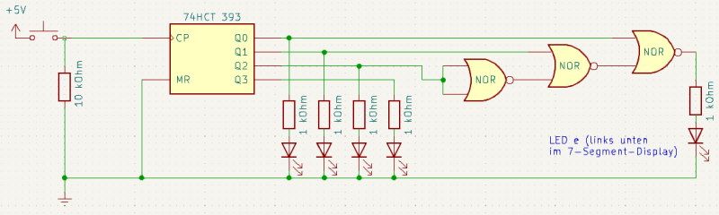 Das Segment e soll dann und nur dann leuchten, wenn $(\mathrm{nicht}\ Q_0)\ \mathrm{und}\ \mathrm{nicht}\ (Q_2\ \mathrm{und}\ (\mathrm{nicht}\ Q_1))$ HIGH ist.