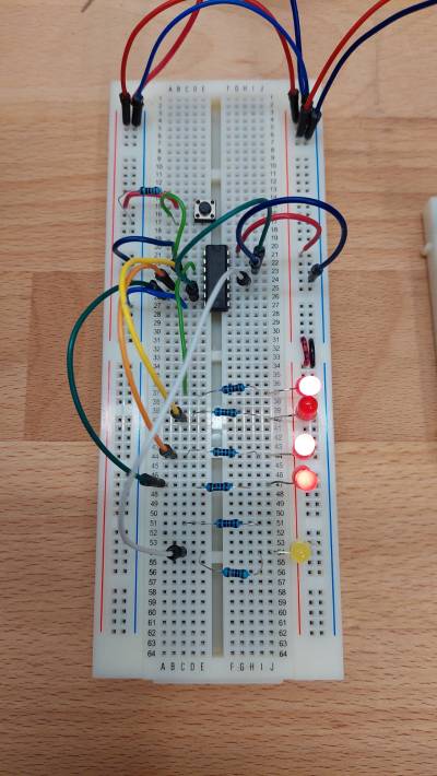 Jedesmal, wenn Du den Taster loslässt, hat dies einen Übergang von HIGH auf LOW am CLock-Eingang des Zähler zur Folge, so dass dieser im Binärsystem um eins weiterzählt.