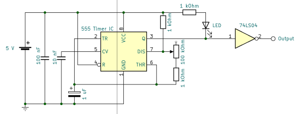 Wir werden in den folgenden Kapiteln immer wieder eine Schaltung benötigen, die Rechteck-Pulse generiert. Dazu verwenden wir das von Ben Eater vorgeschlagene Design.