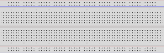 Um schnell Schaltungen bauen und wieder abbauen zu können, nutzen wir Breadboards (deutsch: “Schaltbretter”). Unsere Breadbords haben insgesamt 840 Kontakte, in die Bauteile gesteckt werden können, das Rastermaß ( = kürzester Abstand zwischen zwei Kontakten) beträgt 1/10 inch (2,54 mm).