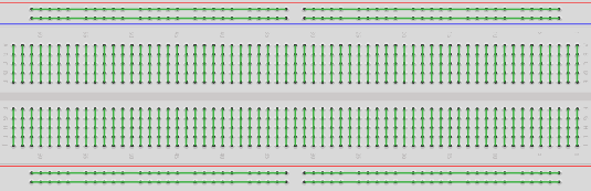 Welche Kontakte innerhalb des Breadboards verbunden sind, ist in der folgenden Grafik in grüner Farbe eingezeichnet: