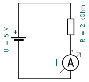 - Die Stromquelle in der Schaltung rechts “drückt” Elektronen aus dem Minuspol in den Stromkreis und zieht sie in den Pluspol hinein. Die Spannung ist ein Maß für die Stärke des “Druckgefälles” zwischen den beiden Polen. Sie wird in der Einheit Volt (V) gemessen.