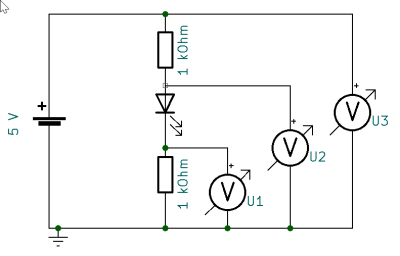 - Die Stromquelle in der Schaltung rechts “drückt” Elektronen aus dem Minuspol in den Stromkreis und zieht sie in den Pluspol hinein. Die Spannung ist ein Maß für die Stärke des “Druckgefälles” zwischen den beiden Polen. Sie wird in der Einheit Volt (V) gemessen.