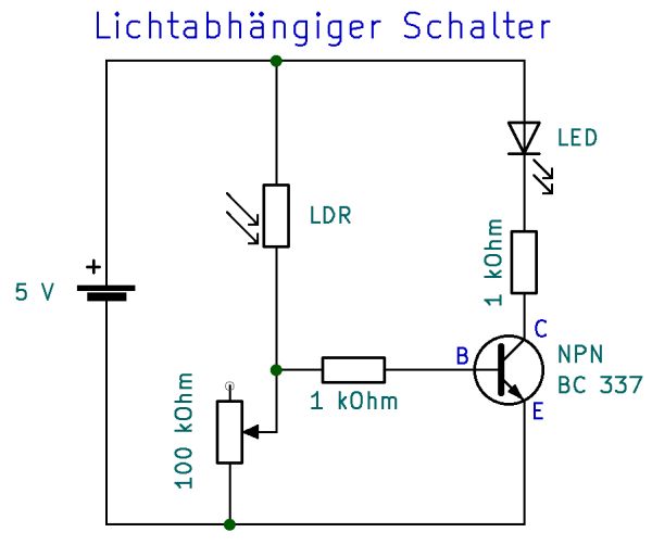 - Ändere die Schaltung so ab, dass beim Beschatten des LDR die LED leuchtet.