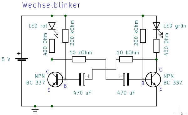 - Solange der rechte Transistor noch nicht durchgeschalten ist, ist der Widerstand seiner C-E-Strecke sehr hoch, daher ist der linke Kondensator über die rechte LED, den rechten $400\,\mathrm \Omega$-Widerstand und den rechten $10\,\mathrm{k\Omega}$-Widerstand mit +5 V verbunden und lädt sich damit über die B-E-Strecke des linken Transistors recht schnell entsprechend seiner Polung (rechts: Plus) zügig auf 5 V - 0,7 V = 4,3 V auf. Die E-B-Spannung des linken Transistors wird dabei 0,7 V nicht unterschreiten, da der linke $200\,\mathrm{k\Omega}$-Widerstand den Stromfluss durch die B-E-Strecke aufrechterhält.